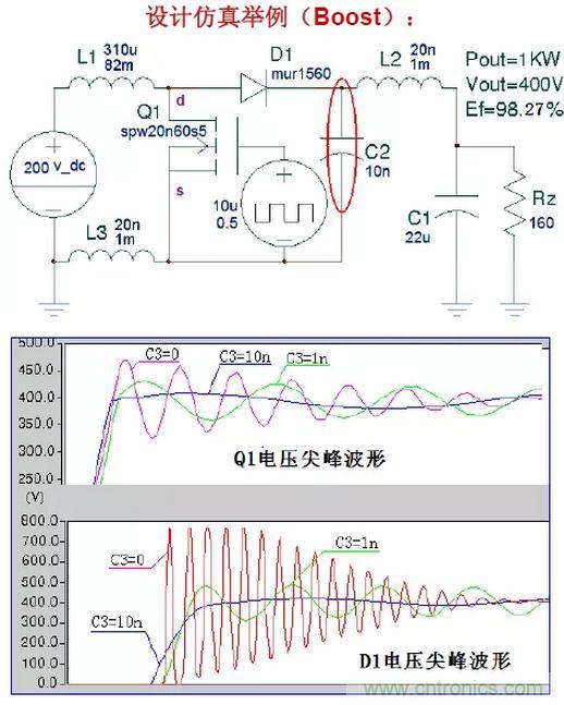 將開關管Q1、拓撲續流二極管D1和一個無損的拓撲電容C2組成一個在布線上盡可能簡短的吸收回路。