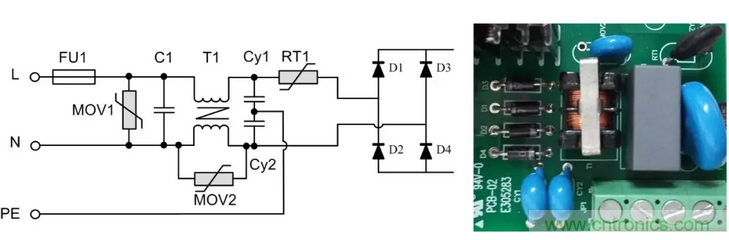 背景:以某型號的電源模塊為例,該模塊是ZLG致遠電子為某客戶定制的電源模塊,輸入85VAC~350VAC,且EMC前級電路電路嵌入到模塊中。抗浪涌要求差模電壓3KV,共模電壓6KV。更換更大的保險絲后可承受6KV差模電壓。其前級原理圖及對應(yīng)實物圖如圖2所示。
