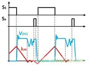 在主開關(guān)管開通前,先開通輔助繞組的開關(guān)管,輔助電源對(duì)輔助繞組進(jìn)行電流反灌,將能量儲(chǔ)存在變壓器中;輔助繞組的開關(guān)管關(guān)斷后,變壓器儲(chǔ)存的能量抽取主開關(guān)管COSS的能量,COSS放電電壓降低,直到其內(nèi)部體二極管導(dǎo)通,這時(shí)候開通主開關(guān)管,就能實(shí)現(xiàn)零電壓開通ZVS。