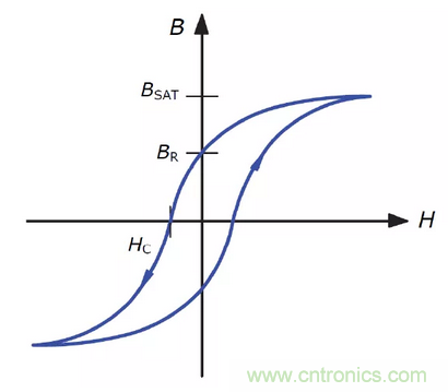 一般高頻電感所用的鐵氧體鐵芯是含有鎳鋅或錳鋅之鐵氧體化合物,屬于矯頑磁力低的軟磁類鐵磁材料。圖1為一般磁鐵芯之磁滯曲線,磁性材料的矯頑磁力HC亦稱為保磁力,系指當磁性材料已磁化到磁飽和后,使其磁化強度減為零時所需的磁場強度。矯頑力較低代表抵抗退磁能力較低,也意味著磁滯損失較小。