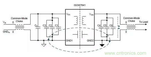 上圖是ISOW7841設(shè)計,使用扼流圈來降低共模電流以及返回路徑環(huán)路面積,間接減少輻射發(fā)射。 共模扼流圈可插入輸入和輸出電源或連接到系統(tǒng)的任何長電纜上。