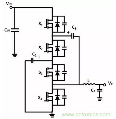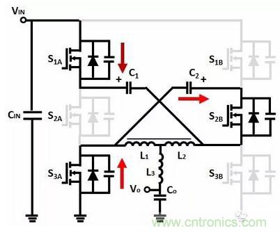 如果C1、C2的電容相等,電感電流等于電容C1、C2的電流之和。S1、S3工作于硬開(kāi)關(guān)狀態(tài),由于S1、S3的電流降低,因此可以同時(shí)降低導(dǎo)通損耗和開(kāi)關(guān)損耗。