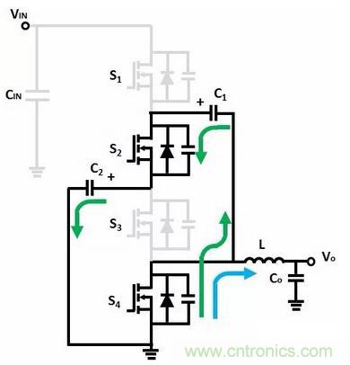 輸入電壓通過(guò)C2向輸出負(fù)載提供能量,同時(shí)C1放電向輸出負(fù)載提供能量。