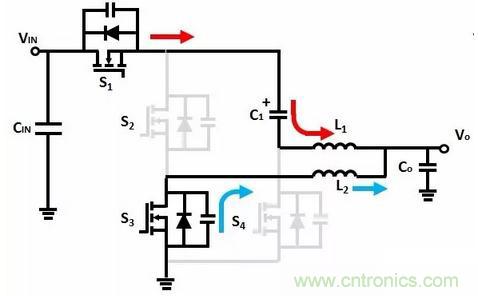 L1激磁,輸入電壓通過(guò)C1向輸出負(fù)載提供能量,同時(shí)對(duì)C1充電; L2去磁,S4續(xù)流。