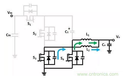 輸出電感去磁,在前面一個(gè)階段過(guò)程結(jié)束時(shí),由于C1、C2的電壓不平衡,當(dāng)S2、S4導(dǎo)通后,將C1、C2并聯(lián),所以電壓高的電容將會(huì)對(duì)電壓低的電容放電,那么,S4不僅流過(guò)輸出電感續(xù)流電流,還要流過(guò)C1、C2充放電的電流,因此其導(dǎo)通損耗會(huì)增加。