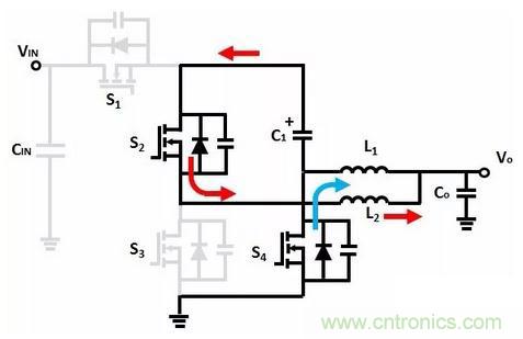 L2激磁,電容C1放電,通過(guò)L2向輸出負(fù)載提供能量; L1去磁,S4續(xù)流。