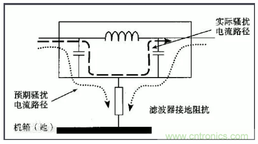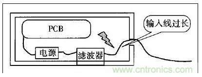 許多設備的電源線進入機箱后,經過很長的導線才接到濾波器的輸入端。例如,電源線從機箱后面板輸入,走行到前面板的電源開關,又回到后面板接到濾波器?;蛘邽V波器的安裝位置距離電源線入口較遠,造成引線太長(如圖1所示)。