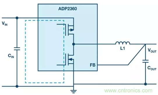 圖1:用于降壓轉(zhuǎn)換的開(kāi)關(guān)穩(wěn)壓器(帶如虛線所示的關(guān)鍵熱回路)。