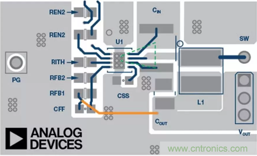 圖2所示為ADP2360的示例布局。在本圖中,圖1中的重要熱回路標(biāo)為綠色。從圖中可見(jiàn),黃色反饋路徑離線圈L1有一定距離。它位于PCB的內(nèi)層。