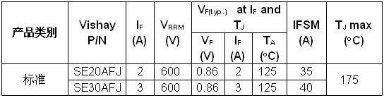 導讀:Vishay近日推出新款通過AEC-Q101認證并具有ESD保護的600V標準整流器SE20AFJ和SE30AFJ。該款高電流密度器件通過AEC-Q101認證,具有高達3A的正向電流。