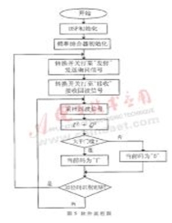 軟件流程如圖5所示。系統(tǒng)開始工作后,DSP初始化,F(xiàn)PGA配置頻率綜合器ADF4127L,產(chǎn)生精準(zhǔn)的頻率源。詢問機轉(zhuǎn)換開關(guān)指向發(fā)射位置,發(fā)射單元發(fā)射詢問脈沖信號,經(jīng)過一段時間后,開關(guān)指向接收位置,接收單元接收回波信號,先進行A/D采樣,并將I路和Q路的采樣值平方相加,若大于編碼門限,則判定當(dāng)前碼為1,否則為0。一幀32位識別碼判別完后,詢問單元重新發(fā)出詢問信號,如此循環(huán)。解調(diào)出的識別碼通過串口送給外部設(shè)備,以供處理。