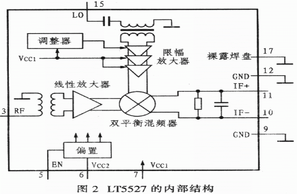 RF輸入端由1個集成變壓器和一個高線性差分放大器組成,變壓器的初級與RF輸入端(引腳3)和地連接,變壓器的次級內部與差分放大器輸入端連接。