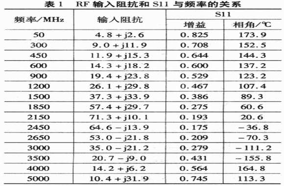 在400 MHz低頻處或3.7GHz處,RF輸入匹配網絡在原有基礎上增加并聯電容器C5,如果450MHz下的輸入匹配電容器C5的容值為12 pF,在評估板的50 Ω輸入傳輸線上,位于距離引腳34.5 mm的位置;900 MHz下的輸入匹配電容C5=3.9 pF,位于距離引腳3 1.3 mm的位置;3.5 GHz下的輸入匹配電容器C5=O.5 pF,位于距離引腳34.5mm的位置。這種串聯傳輸線/并聯電容器匹配拓撲使得LT5527可用于倍頻標準,而不需要修正電路板的設計。串聯傳輸線可用串聯的片式電感器代替,以使布局更簡單。RF輸入阻抗和Sl1與頻率的關系(沒有外部匹配)列于表1。S11數據用于微波電路模擬設計自定義匹配網絡,模擬和RF輸入濾波器的接口連接。