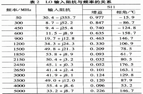 頻率大于1.2 GHz時,盡管放大器提供的功率有幾個dB,但最佳LD驅動功率只有-3 dBm(I/0輸入功率變化,混頻器性能不變);在頻率低于1.2GHz的情況下,盡管-3 dBm的L0驅動功率仍然提供高轉化增益和線性,但是為了得到最佳噪聲,LO驅動功率為0 dBm。自定義匹配網絡的阻抗數據見表2,并參考LO端沒有匹配時的情況。