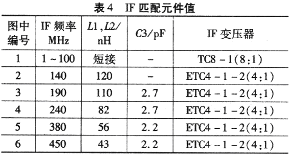 該匹配網絡對40MHz以上(包括40MHz)的IF最為合適。對于40 MHz以下的IF頻率,若串聯電感器(Ll、L2)的電感值取得過高,用這樣的電感和寄生效應將影響穩定性,因此,8:1變壓器適合于低IF頻率。適用于 IF頻率的低通濾波的匹配元件值如表4所示。高Q值線繞片式電感器(Ll、L2)大大改善了混頻器的轉換增益,但對線性度還是有點影響。