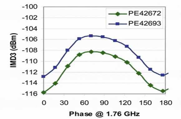 手機中增加的頻段越多,對開關的技術要求就越高,而且WCDMA的線性度和諧波要求對器件性能也帶來了很大的壓力。通過利用UltraCMOS制造工藝的線性優勢,圖2中的單片PE42693 SP6T可以保持其前代SP7T開關+68dBm的IP3,而且IMD3性能超過業界標準的-105dBm(圖1)。
