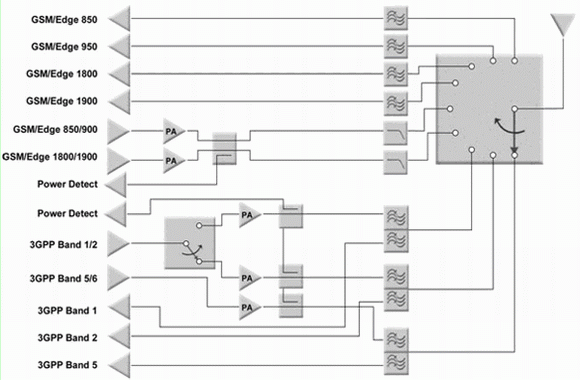隨著多頻段架構的普及,對功放和相關濾波器的數量提出了嚴格的要求。事實上,對功放的技術要求沒有變化,但手機設計需要使用更多的功放。因此真正改變的是需要一個特別高效的方法將所有射頻信號傳送給天線-單片開關。