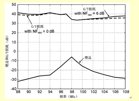 由現場測試可知,在接收FM調頻信號時,ActivvTM有源天線的性能相當于耳機連接線型天線,雖然這兩種天線的尺寸有很大差別。考慮到有源天線的體積小,它的幅射電阻大約只有1mΩ,而寄生損失電阻至少有1Ω左右,增益在-30~-50dBi的范圍內。對于大多數RF工程師來講,這樣的增益是很難接受的。但是有一個因素極大地放寬了接收FM調頻信號時對增益的要求,即很高的環境噪聲溫度。圖8是一個消聲室(為了得到保守的估計)在屏蔽裝置拿走后的噪聲電平。大多數無線系統工作在頻率高于1GHz的范圍,環境噪聲接近室溫,增益為-10dBi,相當于信噪比降低了10dB,在FM頻段內,在城市的大部分地區,由于人為噪聲的影響,噪聲電平高了大約20dB(對于調幅會更高)。因此,與完美的雙極電線相比,效率差的天線收到的信號較弱,噪聲較小。圖9給出了增益不同(0、-20、-40dB)的三種天線不同噪聲溫度時的G/T值。所有三種天線都接到噪聲指數為6dB的接收器上。對于增益為-40dB的實際天線(在室溫下G/T值減少46dB),當情況相同時,在23.000K的典型溫度下性能提高了19dB。對于有源天線,通過壓制接收器的噪聲指數,可以把性能再提高6dB。所以,從信噪比方面看,增益為 -40dB的無源天線,只比完美的雙極天線差27dB。
