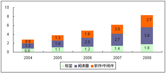 相對中國RFID整體市場來說,RFID在安防領域的應用一直保持著相對穩定的快速增長,2008年,中國RFID安防市場銷售規模達到8.3億元,其中閱讀器所占份額達到46%,是安防市場增長的主要驅動因素。