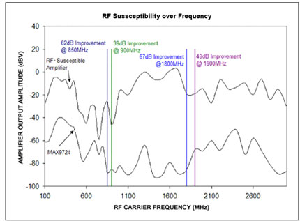 圖2.數據表明:與普通放大器相比,MAX9724有效降低了放大器的RF敏感度
