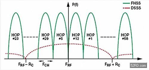 跳頻展頻(FHSS)發射技術是藉由將頻譜切割為一定數量的頻道,以便把時域中的能量加以分散,并在這些頻道之間依虛擬隨機(pseudorandom)順序進行跳躍,或是稱之為跳碼(hoppingcode),這是接收機與發射機中所為人熟悉的。為了迎接新加入網路中的節點(node),控制節點會週期性的送出一標識(beacon)信號,讓新加入的節點能與其進行同步,同步所須時間會依標識期間長度及跳躍的頻道的數量而定。美國與歐洲標準都制訂了相似數量的跳躍頻道,以及400ms的最大停留(dwell)時間(在任何單一跳躍期間內,于某一特定頻率上所花費的時間)。