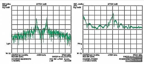 圖四加強說明了頻譜飛散的問題,其中黃色的軌跡線表示當PA以每次100ms的速度開關,而頻譜分析儀維持在最大保持(maximumhold)設定時,ADF7020發射器的PA輸出頻譜。可以很清楚的看出來,有明顯的功率會落入載波(carrier)兩邊的頻道中。藍色的軌跡線則是以每100ms64階的速率被提升與拉下的PA輸出,表示出落入臨近頻道的功率有相當程度的下降。最新的EN300220法令中的規格8.5,便針對落入臨近頻道功率制定限制值。