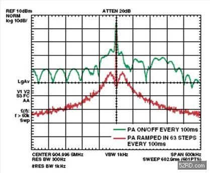 量測程序要求發射器需要在最大輸出功率的情況下開關5次,并分別量測落入載波兩側的第二階、第四階、及第十階頻道。