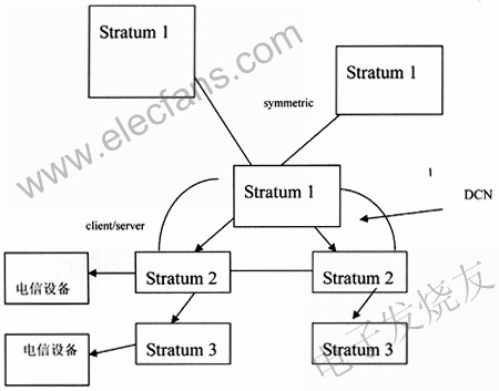 本地網級的Stratum1時間服務器之間互相聯網,以symmetric方式互相校時,避免GPS時間源出故障造成中斷,還可以達到更高精度。Stratum1時間服務器對下級采用client/server方式。Stratum1時間服務器取得GPS時間信號和其他授時方式時間信號,比如其他導航衛星,短波,長波方式,互為備用。上下級Stratum采用DCN相連或專線相連,保持穩定相連。各級時間服務器把時間信號發到各個通信設備,如圖3所示。