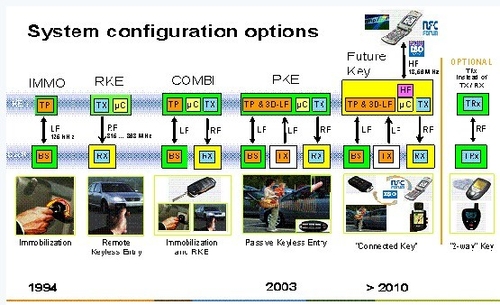 2003,NXP推出了無鑰匙系統(PKE或稱PEPS),徹底改變了汽車安防應用領域的發展前景,給用戶帶來了全新舒適與便利的體驗:車主在整個駕車過程中都完全不需要使用鑰匙,只需要隨身攜帶。當車主進入車子附近的有效范圍時,車子會自動檢測鑰匙并進行身份識別,如成功會相應的打開車門或后備箱;當車主進入車內,只需要按引擎啟動按鈕,車子會自動檢測鑰匙的位置,判斷鑰匙是否在車內,是否在主駕位置,如成功則發動引擎。千萬不要小瞧這個看似不起眼的改變,它在簡化你的生活方面發揮著重大作用。無鑰匙系統絕不僅僅是帶來了舒適與方便,其在安全性方面也有了本質的提高,通過低頻和射頻的雙向通訊,汽車與鑰匙之間可以完成復雜的雙向身份認證,在安全性方面與引擎防盜類似,要遠好于傳統的遙控鑰匙。從2003年少量高端車型成功量產無鑰匙系統開始,全球市場用了兩到三年的時間推廣普及這一技術,目前,幾乎全球每一個主流車廠都有應用NXP的無鑰匙產品,覆蓋中高端的車型,甚至是低端車型。