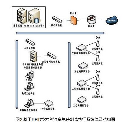 本系統利用部署在車間服務器中的RFID軟件中間件對車間讀寫器網絡進行統一管理,有利于屏蔽RFID設備差異性、提高RFID讀寫器網絡的穩定性和效率,且RFID 設備不依賴工位終端,無需對工位終端進行特殊配置,方便部署。基于RFID 技術的汽車總裝制造執行系統結構如圖2所示: