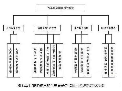 基于RFID技術的汽車總裝制造執行系統功能模塊主要分為車間生產管理、生產線可視化、RFID標簽管理、車間人員管理等四個功能模塊,具體功能結構如圖1 所示: