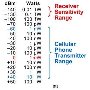 分貝dB是一個相對的值。另一個相關(guān)的單位是毫瓦分貝dBm,它是相對于1mW的絕對功率。圖1給出了dBm的值及其相應(yīng)的瓦特數(shù),其中還給出了移動電話的發(fā)射機發(fā)射功率參考范圍,以及靈敏接收機所能檢測到的最低信號功率。圖2給出的等式定義了室溫下射頻信號的理論熱噪聲。由于射頻信號通過空氣的傳輸以及受到大氣干擾和其它信號的干擾,到達接收機端的信號電平可能變得非常低。接收機常常需要檢測低于0.1pW的信號(或者低于微伏的信號電平)。