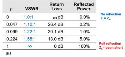 如果某個信號波從一種特征阻抗傳輸?shù)搅硪环N不同的特征阻抗,那么就會引起信號反射和反向傳輸。如果阻抗相同,就不會發(fā)生反射。當由于阻抗不連續(xù)而發(fā)生信號發(fā)射時,就會在傳輸線的兩個方向上出現(xiàn)信號波的傳輸。在這兩個波相位相同的點上,將出現(xiàn)最大的電壓幅值Vmax;在它們相位相差180度的點上,將出現(xiàn) Vmin。Vmax和Vmin的比值稱為電壓駐波比,即VSWR。VSWR是衡量某個連接器或某條線纜的阻抗是否接近50歐姆的一個指標。圖3給出了理想情況下全匹配(沒有反射)、理想開路(100%反射),以及極端情況下這三個值之間的關(guān)系。
