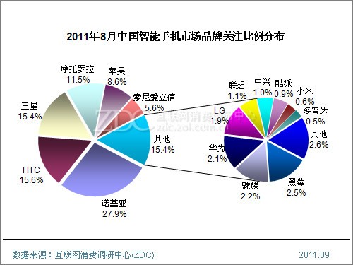 (圖)2011年8月中國智能手機市場品牌關注比例分布