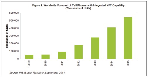 圖中所示為IHS iSuppli公司對(duì)NFC手機(jī)全球出貨量的預(yù)測(cè)。