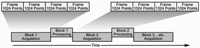 圖5是塊采集模式,可以實現實時無縫捕獲。對塊內部的所有幀,每個采集在時間上都是無縫的。在一個采集塊中的信號處理完成后,將開始采集下一個塊。塊存儲在內存中,可以應用任何實時測量。例如,實時頻譜模式下捕獲的信號可以在解調模式和時間模式下分析。