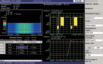 使用 RTSA 可以很容易地測量 TAT [參閱圖4]。首先,需要安裝一個頻率模板觸發(fā)器以獲取標簽與閱讀器之間的整個查詢。RTSA 的功率與時間關(guān)系視圖使用戶能夠觀看整個發(fā)射過程。習慣認為一個下行鏈路傳輸(由閱讀器到標簽)結(jié)束到下一個下行鏈路傳輸開始之間的時間就是半雙工系統(tǒng)的 TAT。將一個標記放在標簽詢問的結(jié)束點,第二個 δ 標記置于反向散射的結(jié)束點或下一次閱讀器進行數(shù)據(jù)發(fā)射的開始點,就可以精確測量出 TAT 時間。在大范圍下行鏈路的條件下維持最短的 TAT 將有助于系統(tǒng)吞吐量的最大化。
