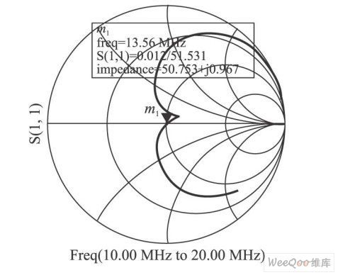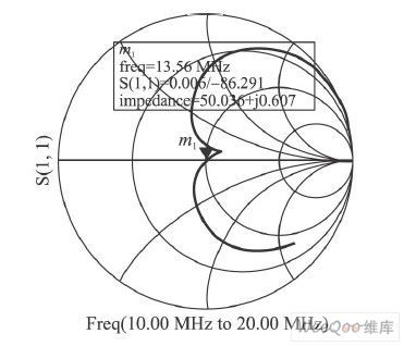 手動(dòng)調(diào)諧即是交替不斷調(diào)整電容C1、C2 的值,同時(shí)觀察曲線變化,直到在所要求的頻率點(diǎn)S11等于0。圖2為某一天線電路在頻率在10~20MHz之間變化時(shí),其反射系數(shù)的變化曲線,其中,標(biāo)記13. 56MHz的點(diǎn), S11值近似為0,達(dá)到了匹配要求。