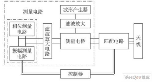 手工匹配采用的是阻抗分析儀或者網(wǎng)絡(luò)分析儀,網(wǎng)絡(luò)分析儀是用定向耦合器來測(cè)量天線電路的反射系數(shù)。但使用定向耦合器有幾個(gè)主要的缺點(diǎn),例如功率損耗大和很難嵌入到IC芯片。故而本文在電路中不使用耦合器,從圖3看出,測(cè)量電路包含以下4部分。