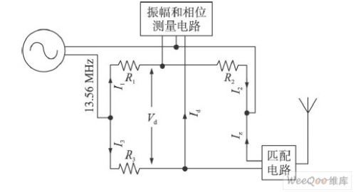 (1)測(cè)量電橋 用來測(cè)試天線的反射系數(shù)。主體部分為惠斯通電路,如圖4所示。其電路中的直流電源用波形產(chǎn)生器替代,用來生成13. 56 MHz的正弦載波信號(hào)。其中電阻R1、R2、R3 都為50 Ω。