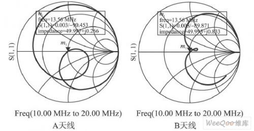 結(jié)果如圖7所示,對(duì)于A, B兩種天線的任何一種,都找到了最優(yōu)C1 和C2 的組合。當(dāng)頻率為13. 56MHz時(shí),兩類天線的反射系數(shù)雖然與0點(diǎn)都有一定的偏差,但其偏差都在可接受范圍之內(nèi)。