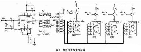 通過對射頻功率信號的測量理論分析,利用AD8318將射頻功率信號轉(zhuǎn)換為電壓信號,然后經(jīng)過PIC16F874單片機進行計數(shù)、查表,由4位LED數(shù)碼顯示出來,實現(xiàn)了大動態(tài)范圍、高精度的射頻功率測量。