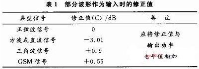 上述情況僅適用于900 MHz~8 GHz的正弦波輸入信號,而通信系統(tǒng)中,還有其他的波形,如果測量其他的波形的功率,則可根據(jù)不同波形的修正C值來進行修正,因波形不同修正值也不相同,表1為不同的信號波形的修正值。
