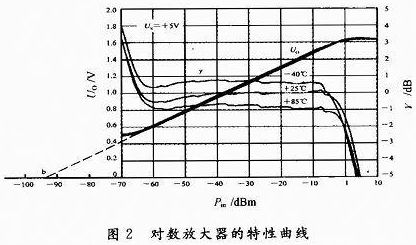 式中:b為截距;Ks為對數(shù)檢測器的斜率,是一個常數(shù);Pin是輸入信號的功率。在一定的動態(tài)范圍內(nèi),可通過Matlab仿真軟件得到對數(shù)放大器的特性曲線,如圖2所示。