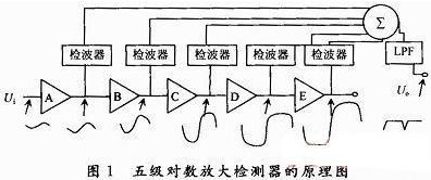 射頻信號檢測的實質(zhì)是如何實現(xiàn)將功率信號無失真地轉(zhuǎn)換成電壓信號,而這個轉(zhuǎn)換工作則由對數(shù)放大檢測器來完成,因此,對數(shù)放大檢測器是射頻測量的關鍵。它的核心是對數(shù)放大器,對數(shù)放大器之間采用直接耦合方式,分成N級,每級由對數(shù)放大器和檢波器組成。每級的輸出送到求和器,由求和輸出經(jīng)低通濾波器后得到一個電壓信號。N一般取值為5~9級,級數(shù)越多,單級增益越小,則輸出特性曲線越趨向于線性,這里以5級為例進行分析,具體電路如圖1所示。