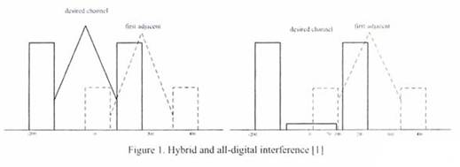 HD無線技術不需要新的頻譜,因為它可利用現有的AM和FM頻段。在HD無線廣播業內,存在混合與全數字兩種形式?;旌夏J绞窃趦蓚€鄰近邊頻帶上傳輸數字信號,在兩個頻帶之間播送模擬信號。全數字模式消除了模擬信道,采用全數字傳輸。與FM和AM信號獲取相比,在接收這種信號時涉及到大量的數字信號處理。對于數字邊頻帶,去除鄰近的模擬信道是必需的(圖1),更復雜的調制方案涉及到正交頻分復用(OFDM)。