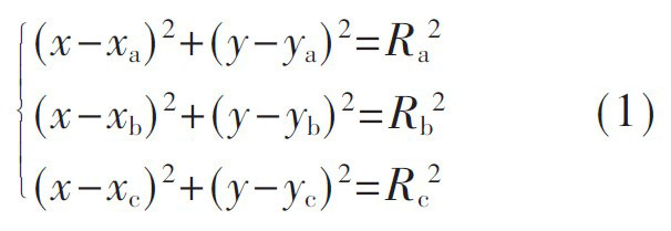 如圖3 所示, 在游戲場館C 區內, 設編號分別為a 、b 、c 的三個有源讀寫器的位置為(xa,ya) , (xb,yb) , (xc,yc) ,游客的位置坐標(x,y), 三個讀卡器到游客的距離分別為Ra、Rb、Rc, 由時間信息定位方法(TOA) 可得式(1) , 即可求解游客的位置坐標(x,y)。