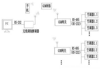 圖中系統(tǒng)可分為4部分;(1) PC(包括一個(gè)通過串口連接的無線調(diào)制調(diào)解器)或手機(jī),通過GSM網(wǎng)絡(luò)發(fā)送或接收數(shù)據(jù);(2)GSM網(wǎng)絡(luò);(3) GSM網(wǎng)關(guān),是PC和家電通訊的橋梁;(4) 網(wǎng)絡(luò)家電,可以是網(wǎng)絡(luò)空調(diào)、冰箱、電熱器具、電動(dòng)窗簾等(下以空調(diào)為例)。