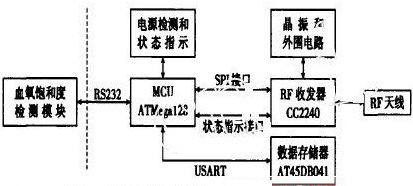 MCU部分是WPAN通信模塊的核心,完成通信模塊各組成部分的控制、協(xié)調(diào)和數(shù)據(jù)的加工。具體功能:通過RS232接口與血氧飽和度檢測模塊通信,實(shí)現(xiàn)對(duì)它的控制和配置,并接收檢測數(shù)據(jù);通過SPI接口和狀態(tài)指示接口實(shí)現(xiàn)對(duì)RF收發(fā)器的配置和檢測,并完成發(fā)射和接收的數(shù)據(jù)交換;通過USART接口與數(shù)據(jù)存儲(chǔ)器連接,完成數(shù)據(jù)存儲(chǔ)器的讀寫操作;通過電源檢測和狀態(tài)指示部分,監(jiān)測電源電壓情況,并能通過狀態(tài)指示產(chǎn)生報(bào)警提示。