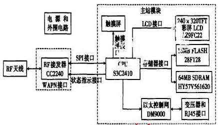 檢測儀主站的主要功能:經(jīng)WPAN接口與移動(dòng)采集終端通信,實(shí)現(xiàn)對(duì)移動(dòng)采集終端的控制,并接受來自移動(dòng)采集終端的采集數(shù)據(jù);通過顯示器模塊以字符或圖形方式顯示采集的歷史數(shù)據(jù)或?qū)崟r(shí)數(shù)據(jù);通過觸摸屏以菜單形式完成控制或查詢命令的輸入;按用戶要求實(shí)現(xiàn)對(duì)歷史數(shù)據(jù)的管理和挖掘,存儲(chǔ)采集的歷史數(shù)據(jù)并具備歷史數(shù)據(jù)的自動(dòng)清除和鎖定功能;具備快速以太網(wǎng)接口,通過該接口可實(shí)現(xiàn)與后臺(tái)管理系統(tǒng)的連接。